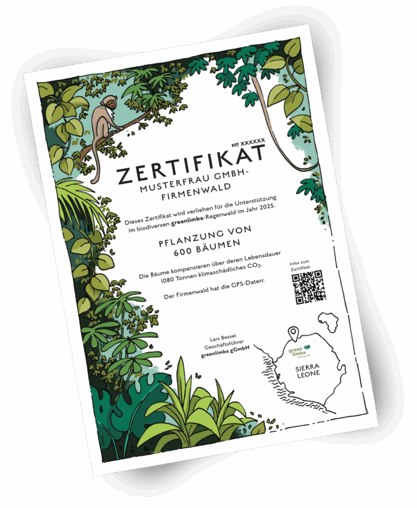 greenlimba pflanzt in Westafrika einen neuen Regenwald, biodivers und nachhaltig. Wir bieten Firmen die Möglichkeit, mit uns ihren ganz eigenen Firmenwald zu pflanzen und damit sowohl im Bereich Human Resources als auch im Marketing und in der Firmendarstellung einen starken Eindruck zu hinterlassen.